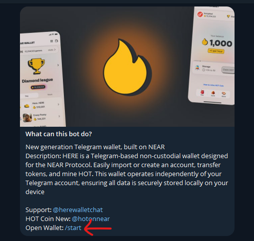 2. HOT 코인 텔레그램 봇 접근한 뒤 "/start" 링크 클릭하기
