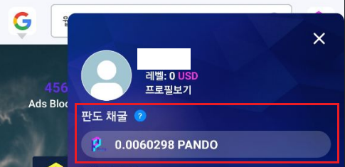 5. PANDO 브라우저 홈에서 우측 상단 버튼 클릭 시 실시간으로 마이닝 현황 확인 가능