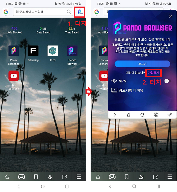 3. PANDO 브라우저 실행 후 오른쪽 상단의 이미지 클릭 후 가입하기 눌러 가입 진행하기