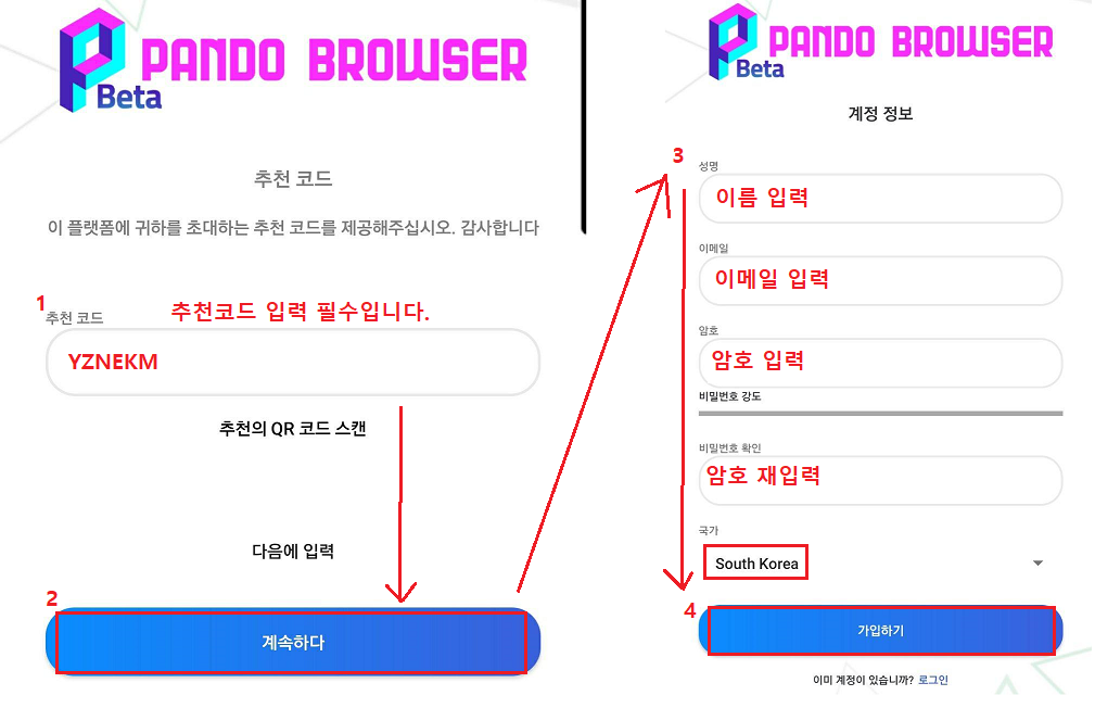4. 추천입 입력 및 아이디, 비밀번호, 국가선택 후 회원가입 진행하기